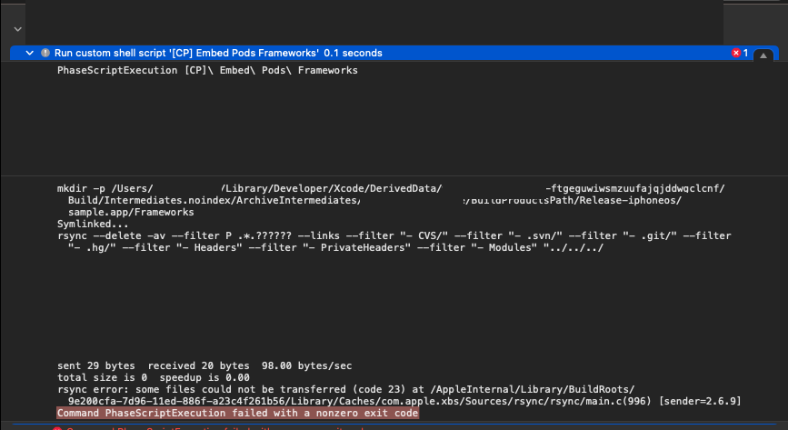 CocoaPods을 사용하는 프로젝트에서 Xcode 14.3 이상으로 업데이트 후 Archive 시에 Targets Support Files 내의 frameworks와 관련된 스크립트에서 rsync와 관련하여 아래와 같이 에러가 발생합니다.