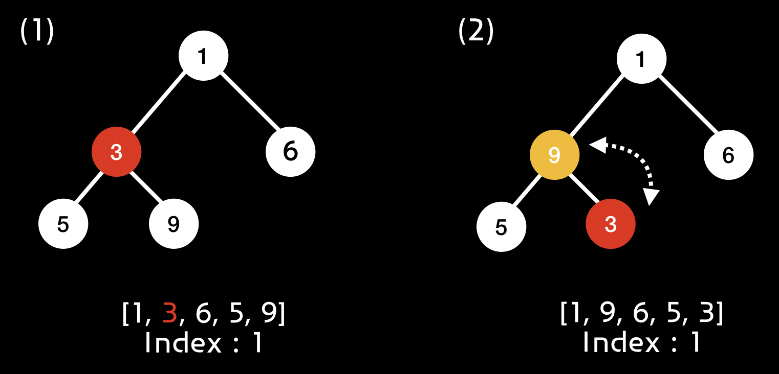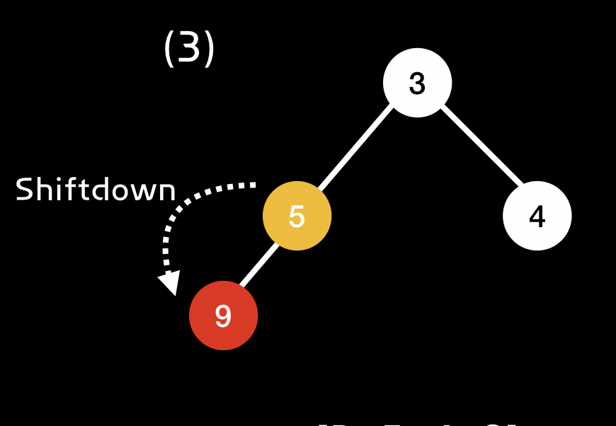 3. 루트로 옮겨진 노드 아래의 자식 노드와 힙 조건 검사 후 조건이 맞지 않으면 인덱스 및 데이터 교체(ShiftDown)