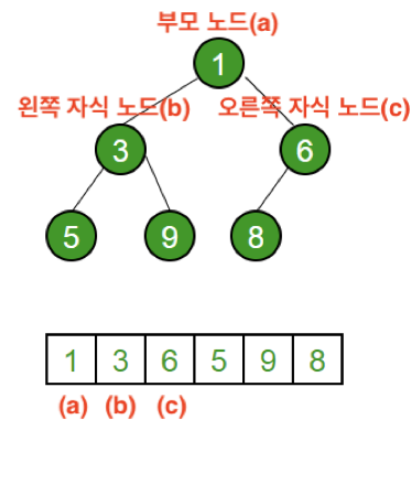 - 최소 힙(Min Heap) : 부모 노드의 키 값이 자식 노드의 키 값보다 작거나 같은 완전 이진 트리