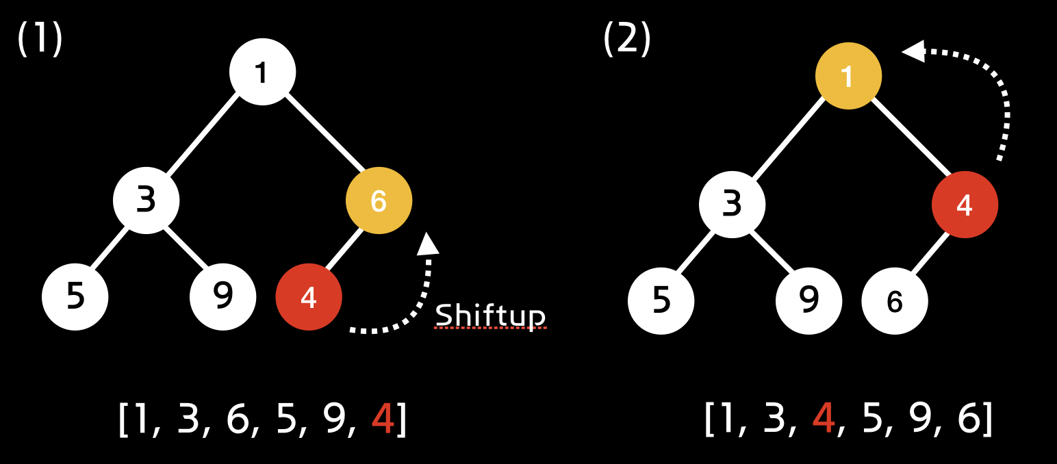 2. 위의 부모 노드와의 비교 후 입력된 데이터가 더 작을 경우 부모 인덱스와 현재 인덱스 및 데이터 값 교체(ShiftUp)