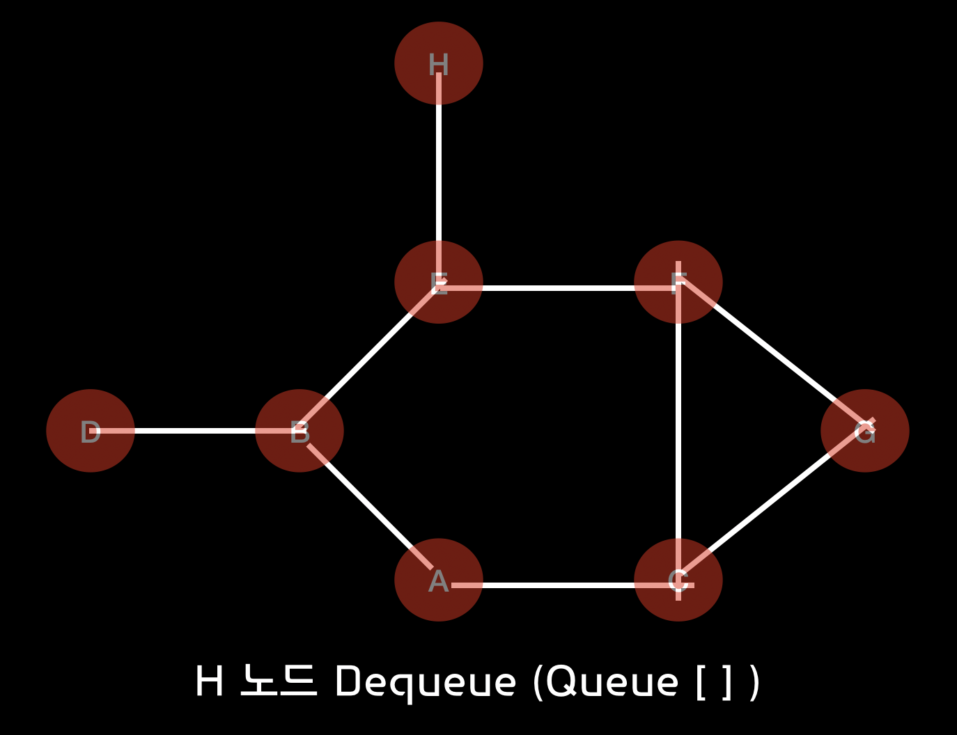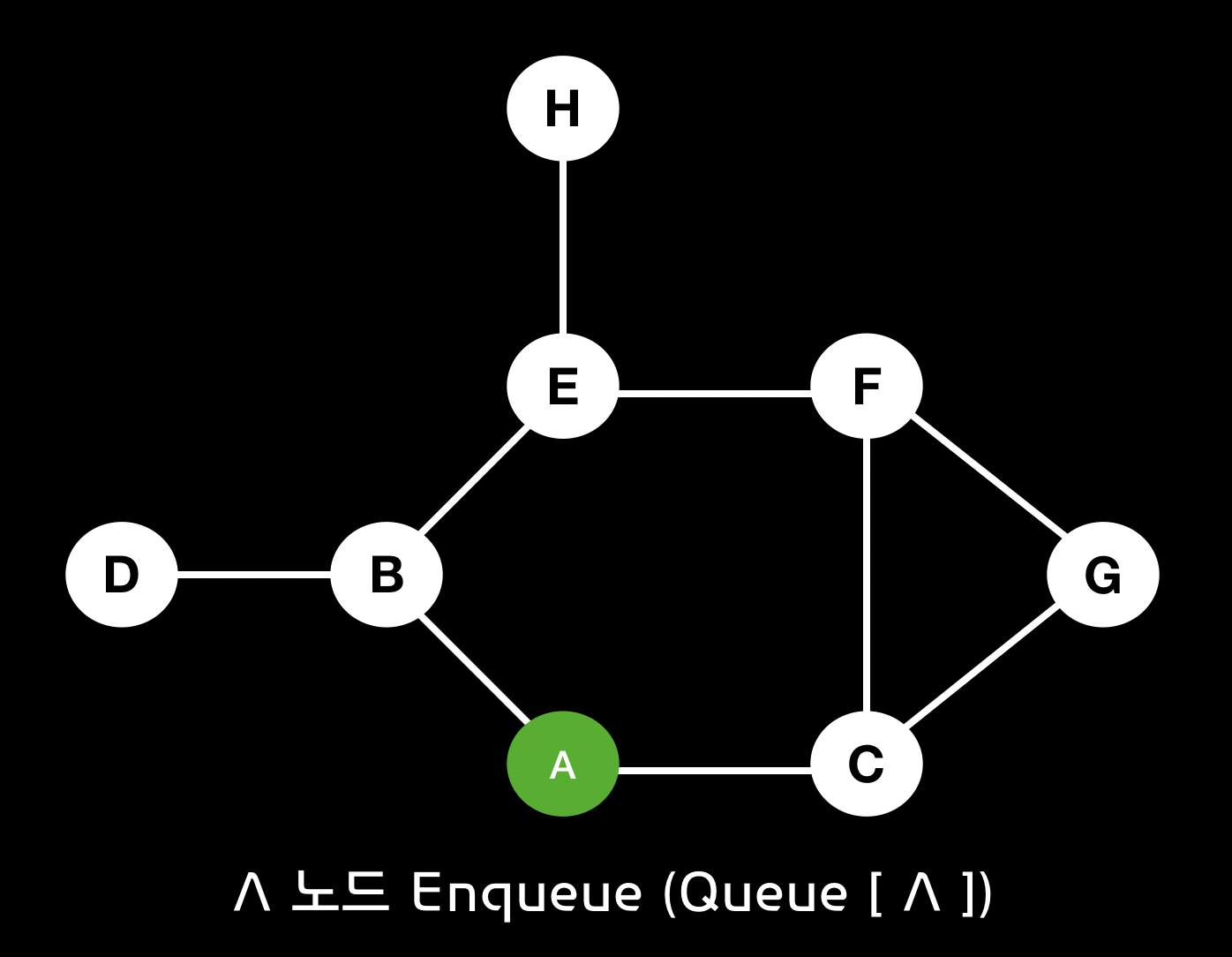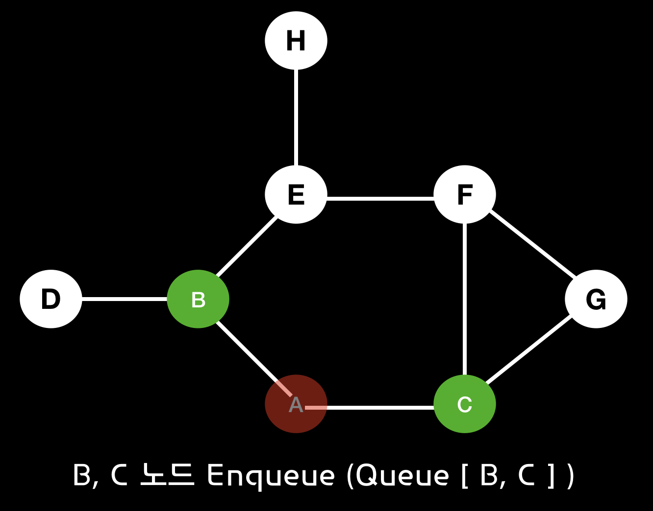 BFS 알고리즘을 통하여 A 노드에서 시작한 경로에 대한 과정을 살펴보면 다음과 같습니다.