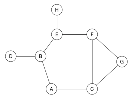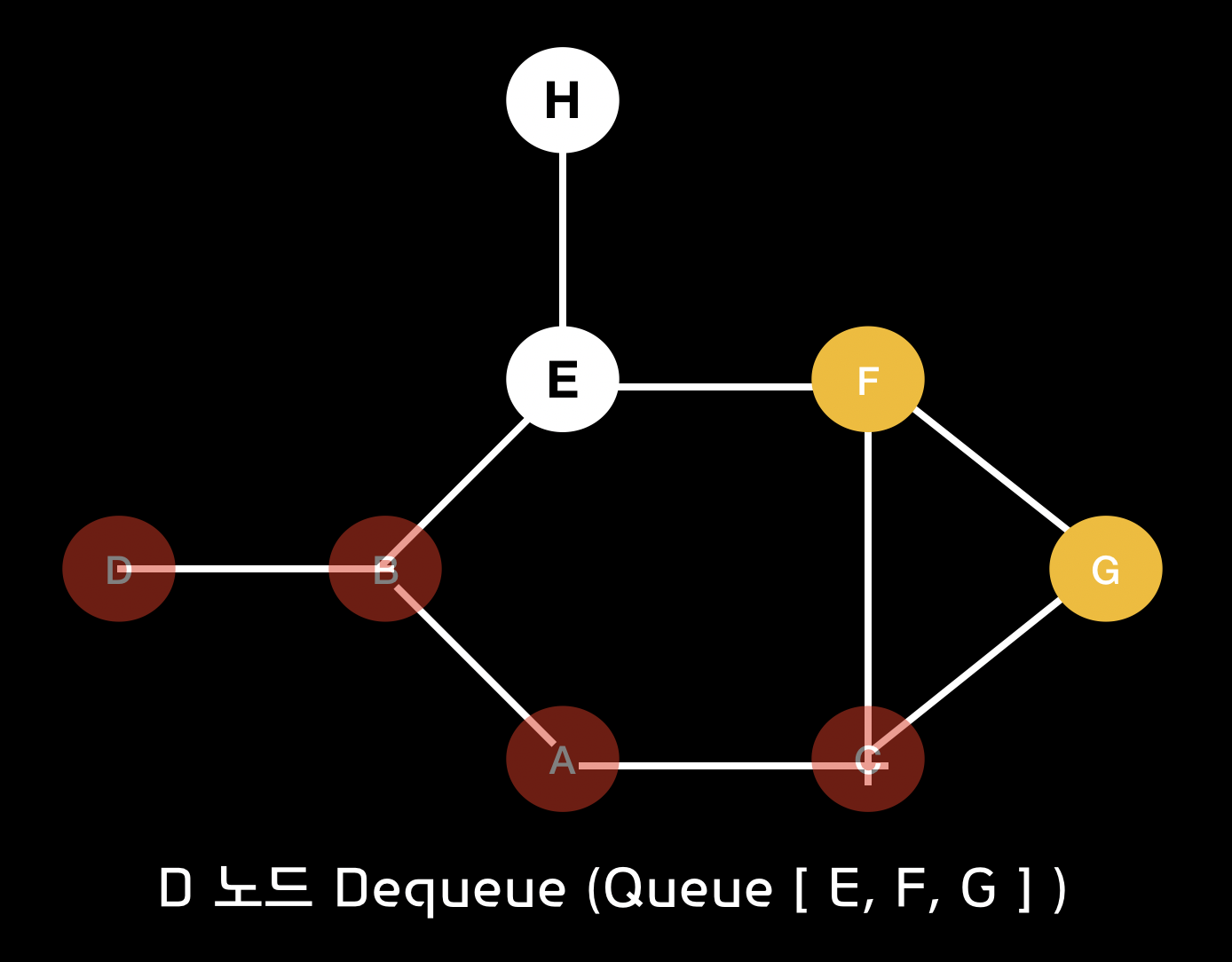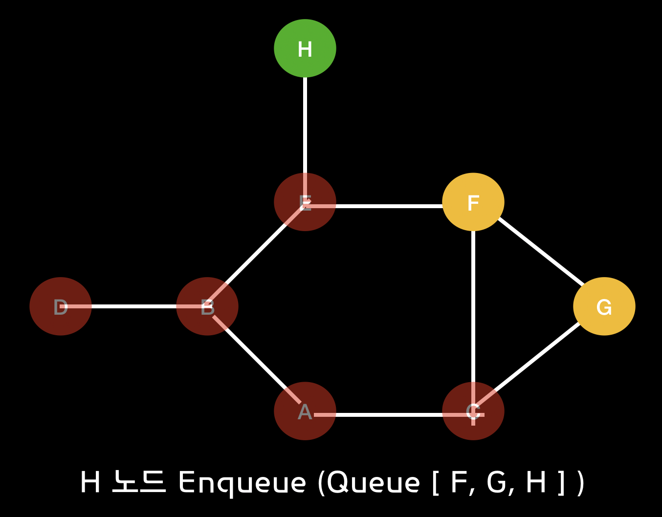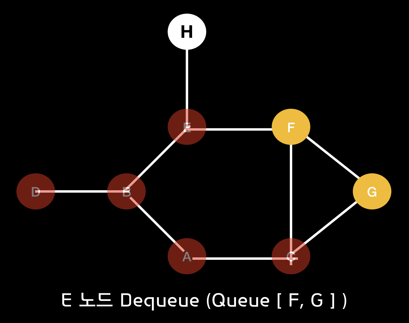 BFS 알고리즘을 통하여 A 노드에서 시작한 경로에 대한 과정을 살펴보면 다음과 같습니다.