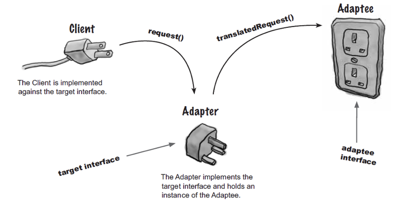 Adapter : Adaptee(기존 객체)와 클라이언트 중간에서 연결시켜주는 역할을 한다. 타겟(Target) 인터페이스를 구현하며 클라이언트는 타겟 인터페이스를 통해 어댑터에 요청을 보낸다.