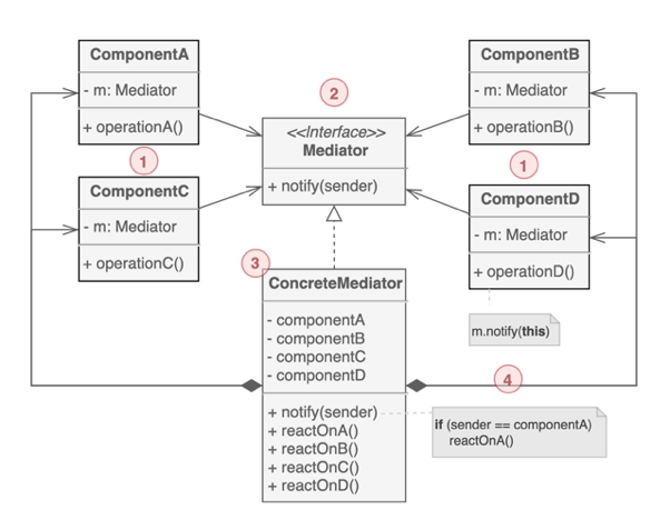 ConcreteMediator : Component 객체들을 가지고 있으면서 중재해주는 역할을 하는 객체