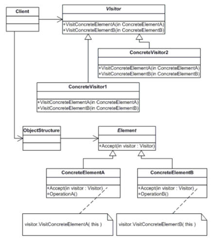 Visitor : 각 ConcreteElement 객체에 대해서 방문할 수 있는 방문자 기본 클래스로서 방문을 할 객체들에 대한 기본 인터페이스 메소드에 대한 정의를 하는 객체