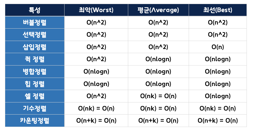마찬가지로 지금까지 살펴본 정렬 알고리즘들의 시간 복잡도를 다시 한번 비교해보겠습니다.